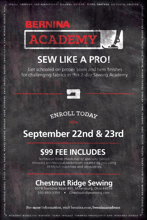 Learn seam and hem finishes to "Sew like a Pro" on various fabrics. We will use the Creative Consultant, built in the BERNINA machines, to guide and lead students through the course. Students will sew on 20 different fabrics and compile the fabric samples in a Technique Book.