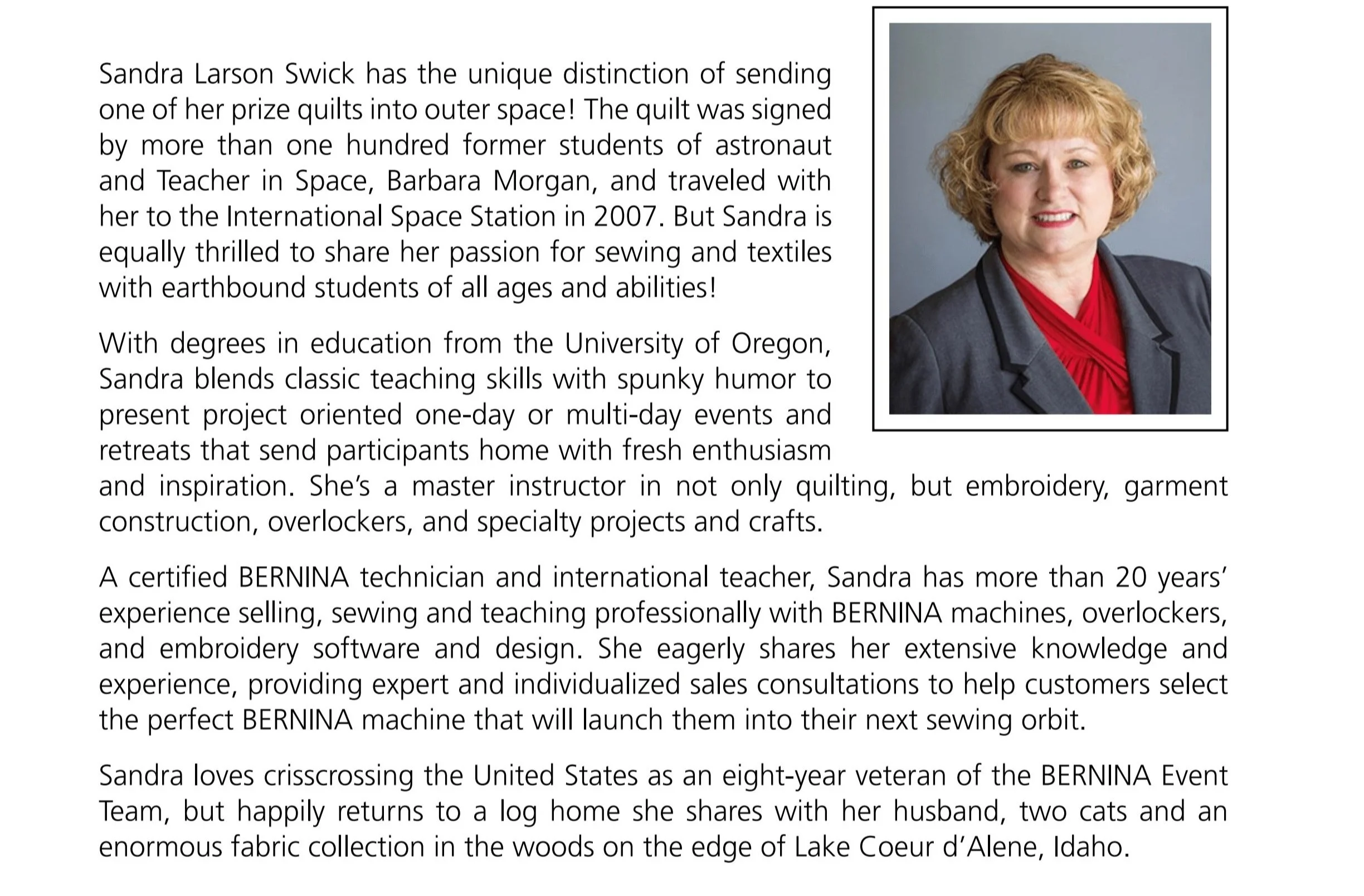 The cost of this event can be applied to the purchase of a *Laurastar Ironing System, or new BERNINA machine purchase.