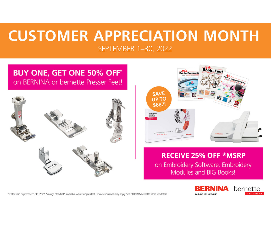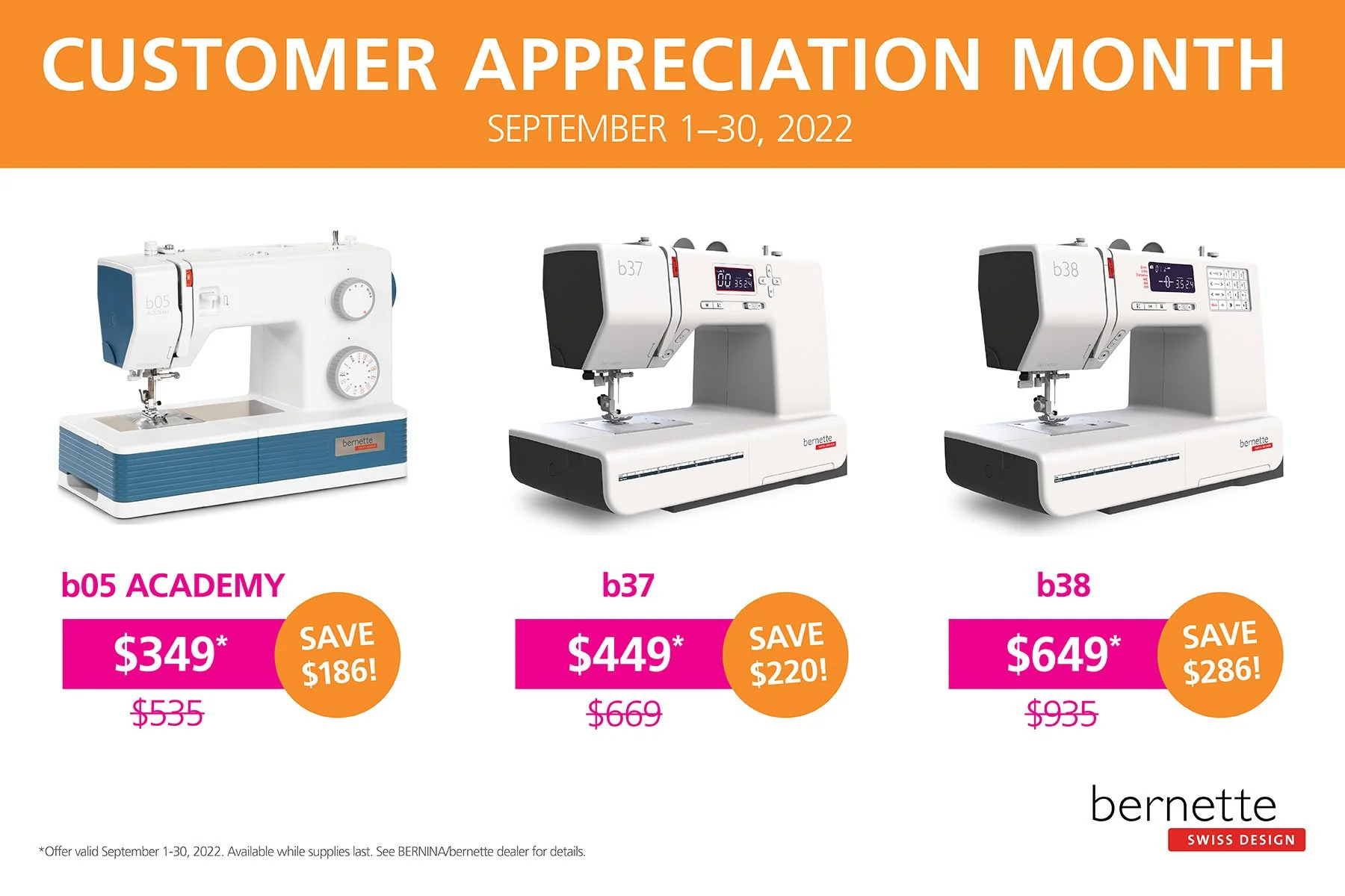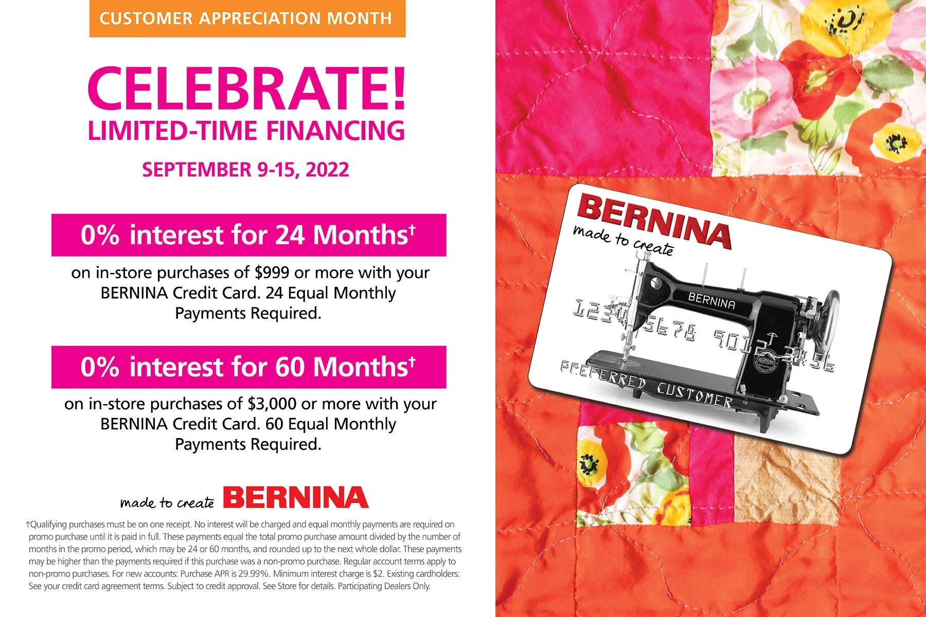 Customer Appreciation Month Thursday, September 1, 2022 9:00 AM 09:00 Friday, September 30, 2022 5:00 PM 17:00 Chestnut Ridge Sewing 5079 T.R. 401 44654 United States (map) Google Calendar ICS LIMITED TIME FINANCING OFFERS Only Available September 9th-15th APPLY NOW BUY NOW