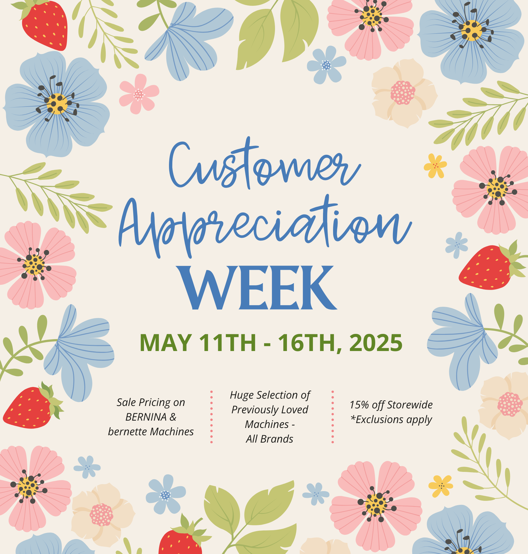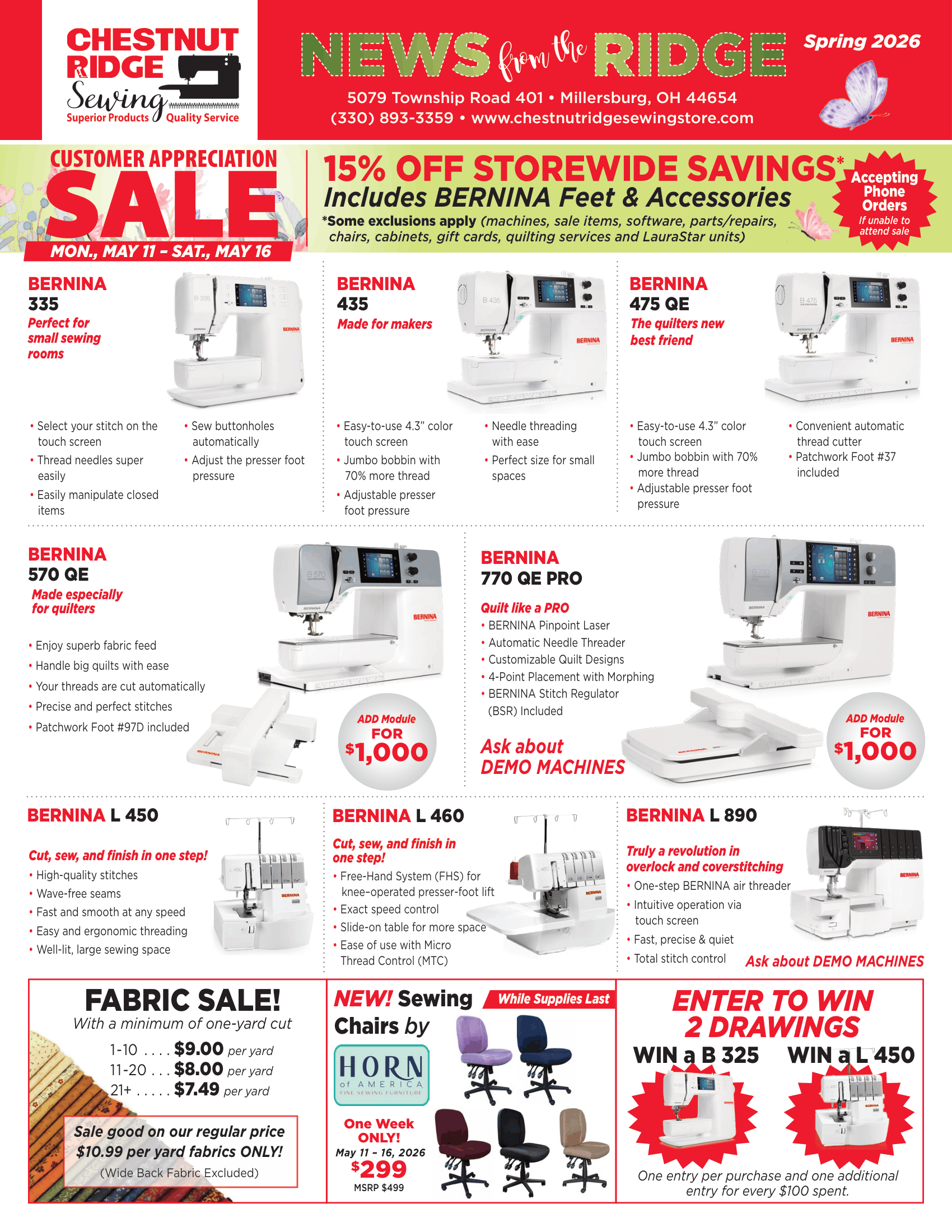 Customer Appreciation Week Monday, May 11, 2026 9:30 AM 09:30 Saturday, May 16, 2026 1:00 PM 13:00 Chestnut Ridge Sewing 5079 T.R. 401 44654 United States (map) Google Calendar ICS